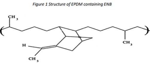 The ethylene and propylene monomers combine to form a chemically saturated, stable polymer backbone providing excellent heat, oxidation, ozone and weather aging. A third, non-conjugated diene monomer can be ter-polymerized in a controlled manner to maintain a saturated backbone and place the reactive unsaturation in a side chain available for vulcanization or polymer modification chemistry. The terpolymers are referred to as EPDM (or ethylene-propylene-diene with “M” referring to the saturated backbone structure). An EPDM polymer structure is illustrated in Figure 4. The ethylene-propylene copolymers are called EPM.